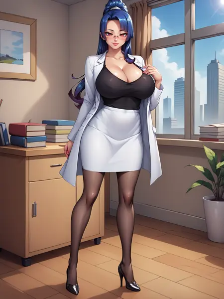 办公室女郎, 实验室外套, 白色迷你裙, 铅笔裙, 黑色背心, 连裤袜, 高跟鞋
