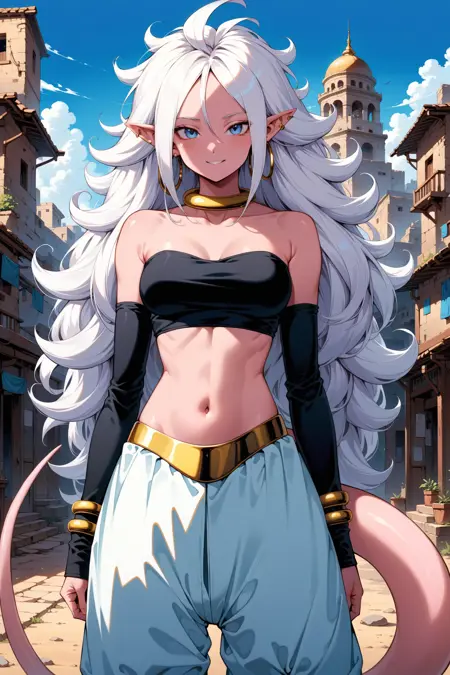 服装2 (魔神形态:蓝眼睛)bbandro, 白发, 长发, 凌乱头发, 尖耳朵, 圆环耳环, 蓝眼睛, 粉色皮肤, 尾巴, 裸露肩膀, 无吊带, 管状上衣, 分离袖子, 手镯, 露脐, 阿拉伯宽松裤, 白色裤子