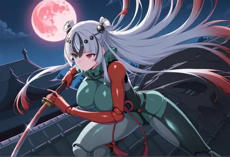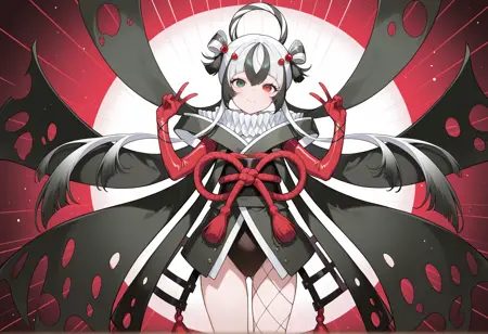 arthropod girl, multicolored hair, black hair, white hair, very long hair, hair ring, heterochromia, red eyes, green eyes, asymmetrical legwear, japanese clothes, kimono, white collar, elbow gloves, red gloves