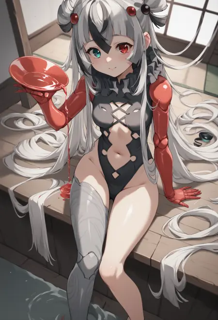Asc1: 절지동물 소녀, 다색 머리카락, 검은 머리카락, 하얀 머리카락, 매우 긴 머리카락, 머리카락 고리, 이채색 동공, 빨간 눈, 초록색 눈, 비대칭 하의, 일본 복장, 기모노, 흰색 칼라, 팔꿈치 장갑, 빨간 장갑