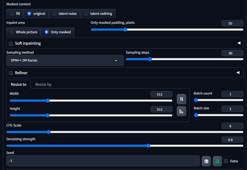 その後、denoise 0.6、512x512、original、only maskedで処理します。