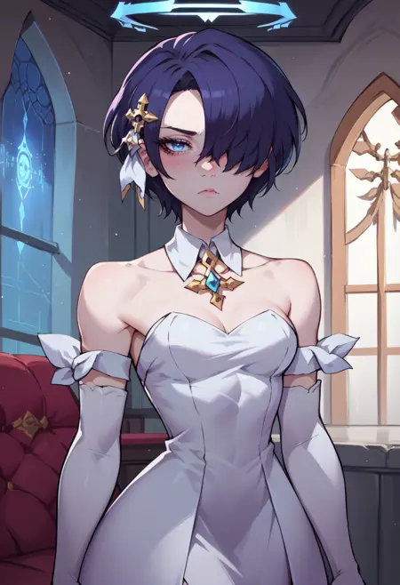 默认服装: 尖顶帽,光环,军装,白色夹克,十字架,长袖,白衬衫,白手套,白裤子