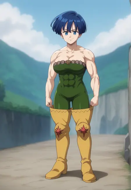 짧은 머리, 파란 머리, 파란 눈, 큰 가슴, 근육질의 여자