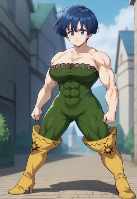 bare shoulders, cleavage, green bodysuit, yellow boots