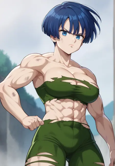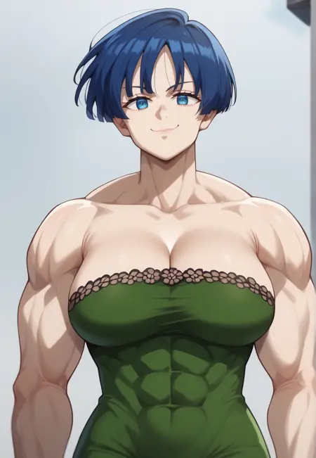 short hair, blue hair, blue eyes, large breasts, muscular female