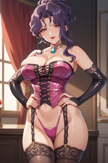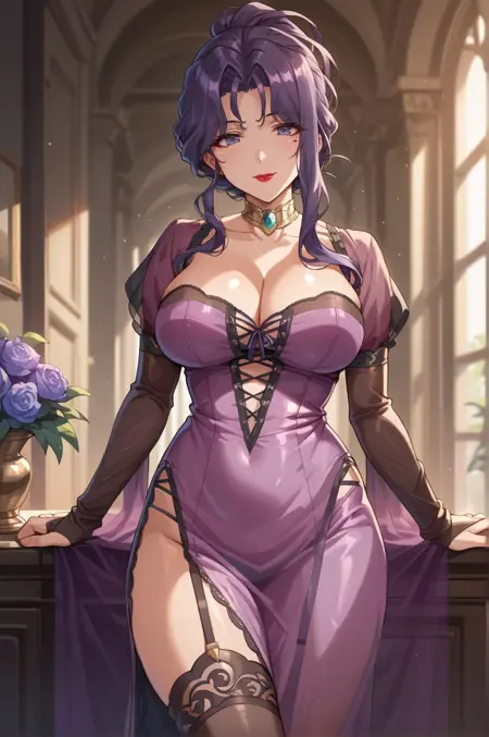 长发,紫色头发,大乳房,紫色眼睛,眼下有痣,妆容,红唇,盘发服饰