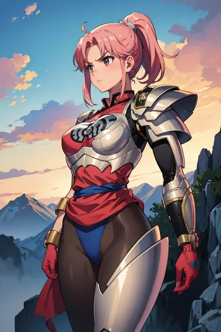 添加 "armorMaam, 马尾辫, 铠甲裙, 铠甲, 铠甲腿套, 单臂铠, 连裤袜" 以获得她的铠甲装。