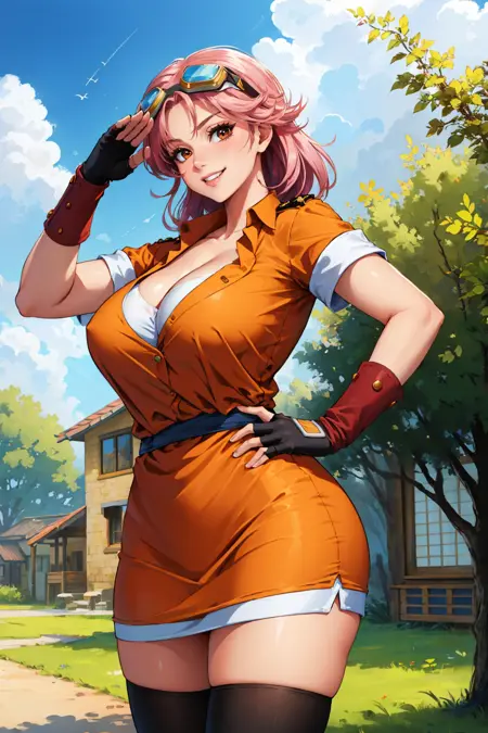 添加 "plainMaam, 中长发, 护目镜戴在头上, 橙色上衣, 短袖, 露胸, 橙色短裙, 棕色手套, 无指手套" 以获得她的橙色连衣裙。