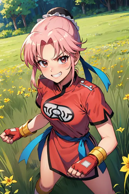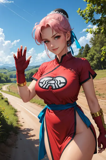 Add "martialMaam, hair bun, short hair, china dress, short sleeves, sash, fingerless gloves" for her Martial Artist outfit.