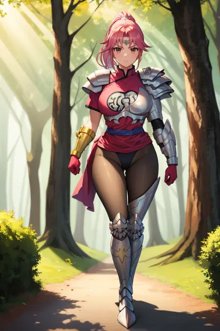 Add "armorMaam, ponytail, armored dress, armor, armored legwear, single gauntlet, pantyhose" for her armored outfit.