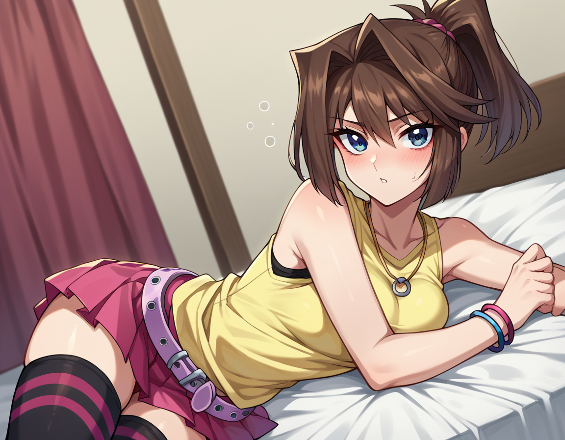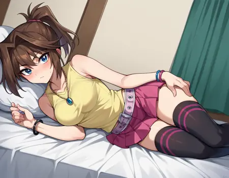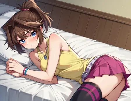 裸の肩、ベルト、ブラックのフィッシュネット、ブレスレット、ジュエリー、ミニスカート、ネックレス、プリーツスカート、ポニーテール、スカート、ノースリーブ、フィッシュネット、イエローシャツ、ピンクスカート,