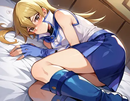 蓝色鞋履,蓝色手套,蓝色短裙,靴子,决斗学院制服(游戏王GX),肘部手套,露指手套,手套,夹克,迷你裙,短裙,无袖,无袖夹克,无袖衬衫,白色夹克,