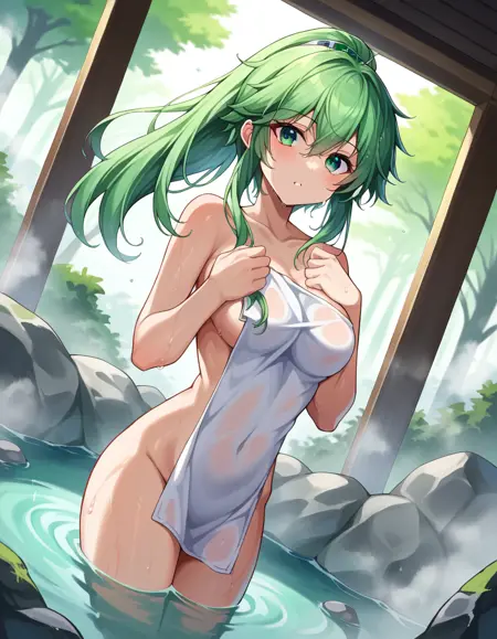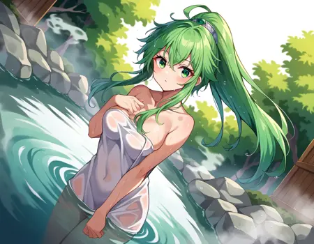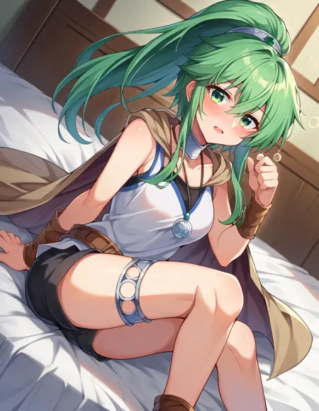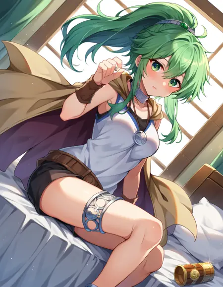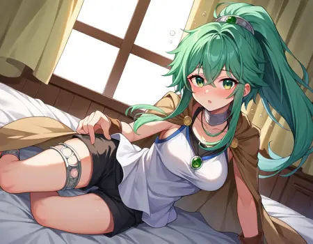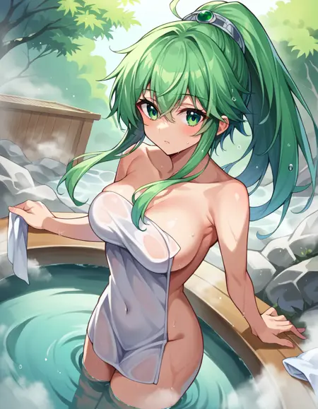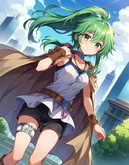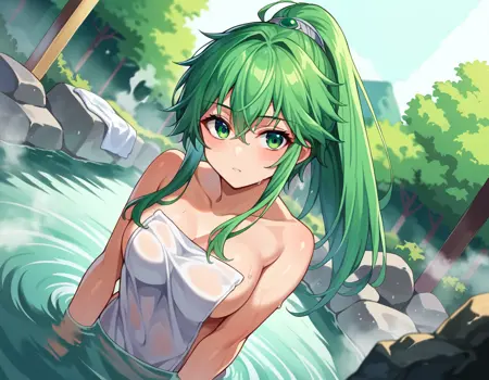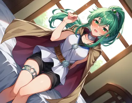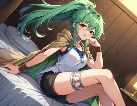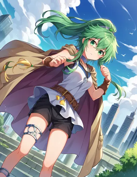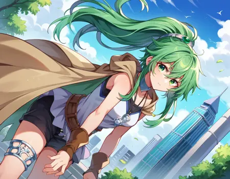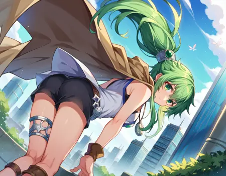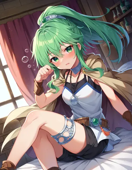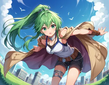 winda priestess of gusto, green eyes, green hair, long hair, ponytail,
