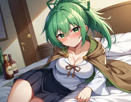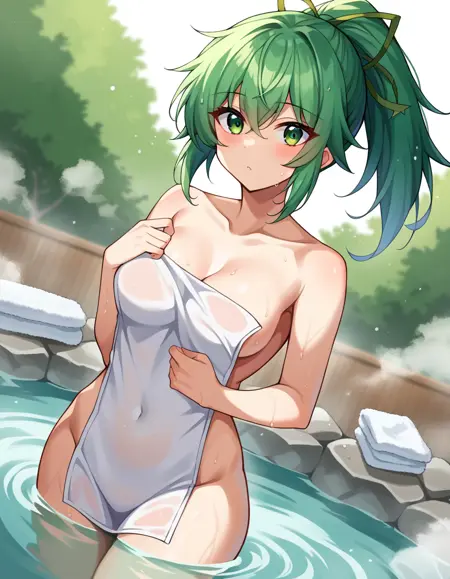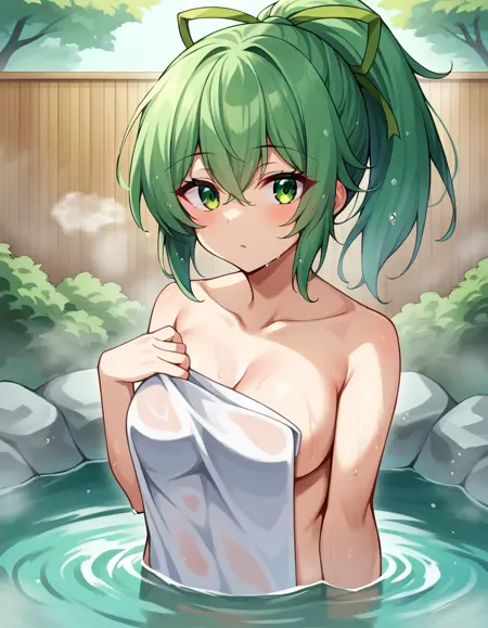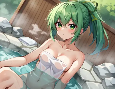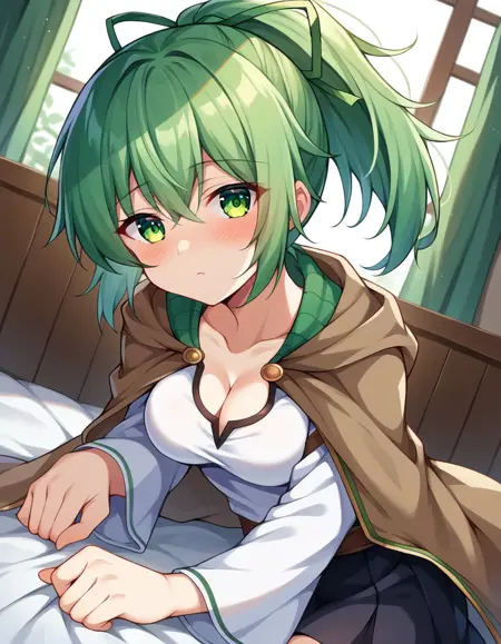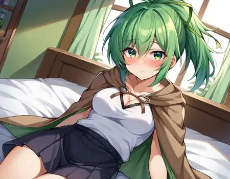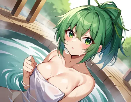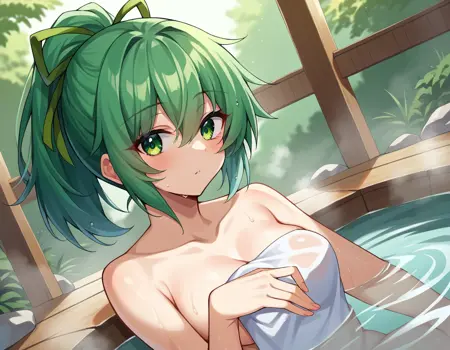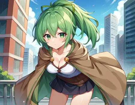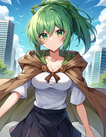 wynn the wind charmer, eyes visible through hair, green eyes, green hair, ponytail, ribbon, hair ribbon,