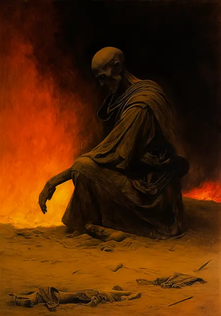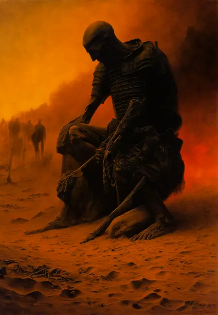 "beksinskiart, a painting of a man kneeling down in the sand