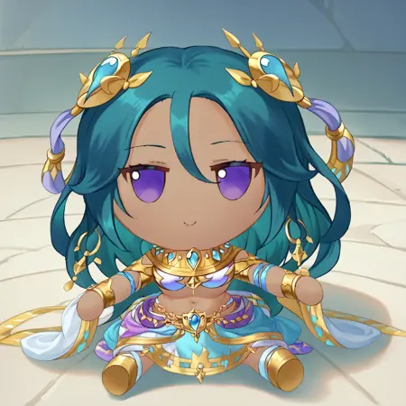 보석, 목걸이, 귀걸이, 머리 장식, 무용수, 파란 보석, 흰 치마, 금장식, 팔찌, 흰 스카프, 가슴, 배꼽, 큰 가슴, 파란 사롱, 보라색 띠, 팔찌, 파란 팔찌, 샌들, 하이힐 - 그녀의 "기본" 복장