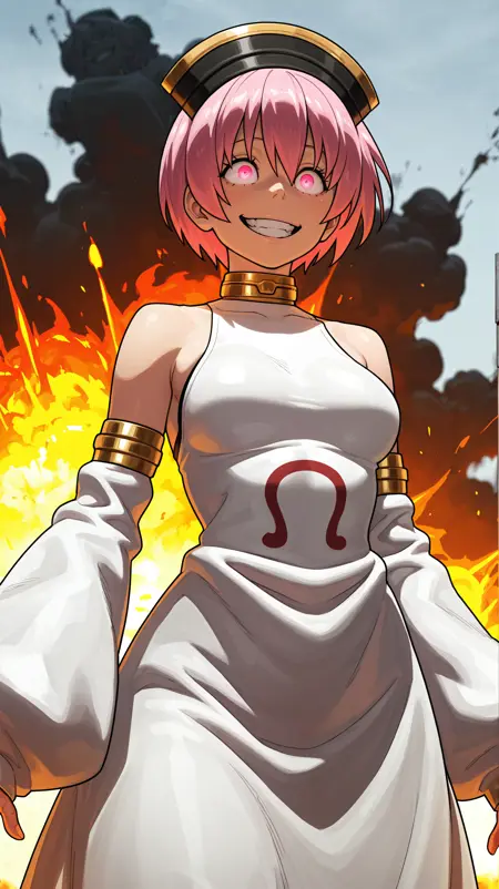 short hair, pink hair, pink eyes, ashenf uniform, white outfit, detached sleeves, gold collar, black headdress, baggy clothes, oversized clothes,