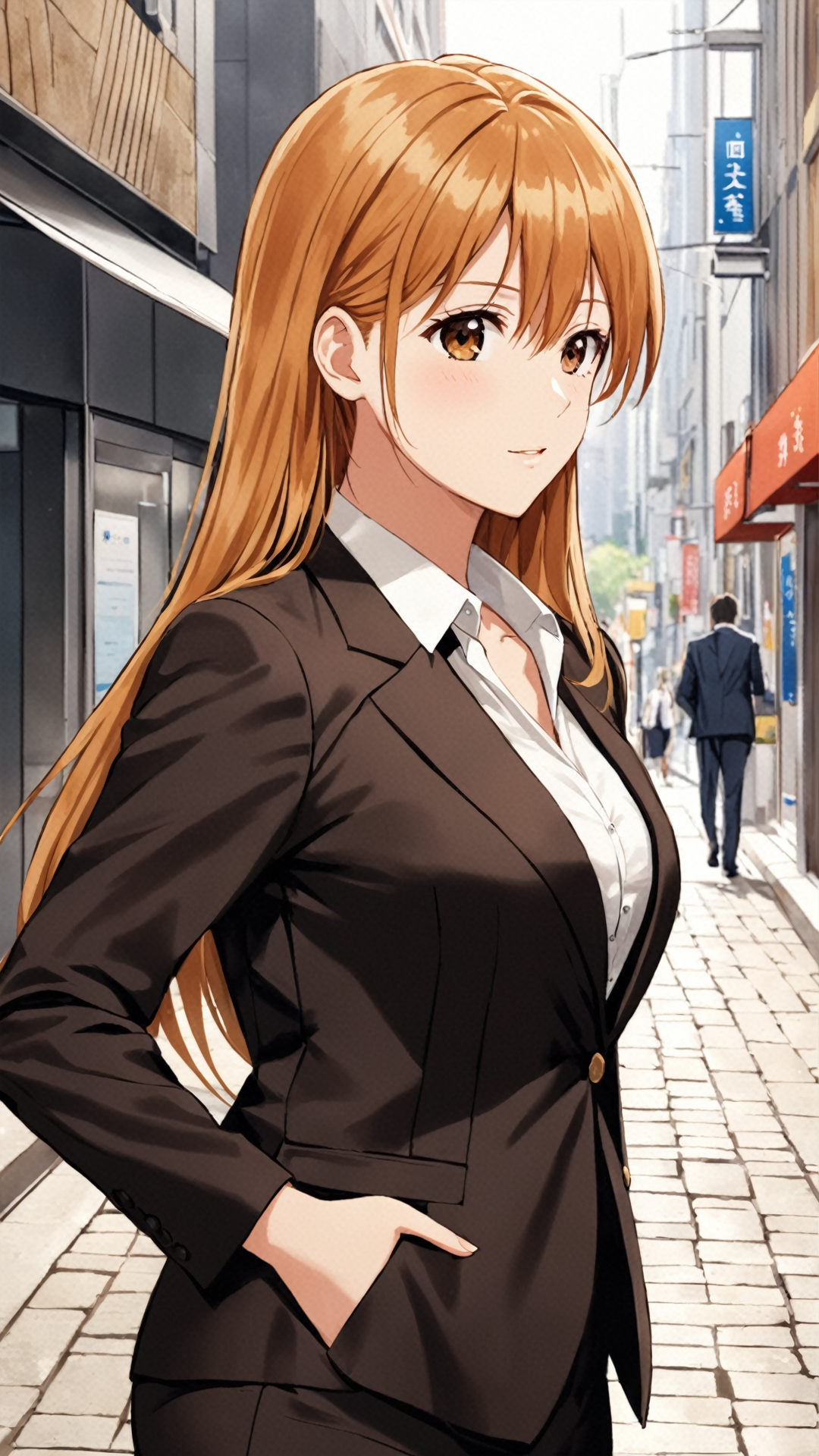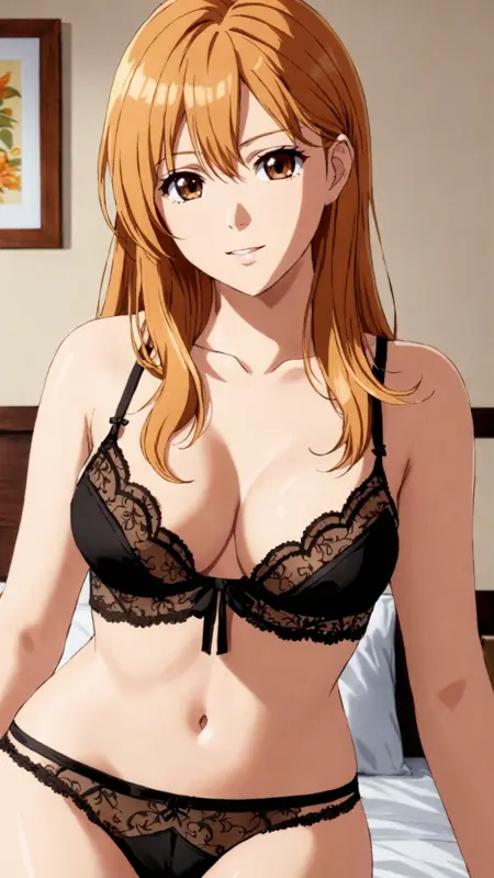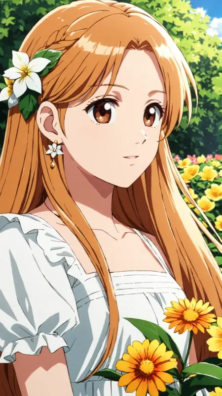 Leona, ginger blonde hair, long hair, brown eyes, hair ornament, earrings, white dress, golden collar, golden armband,