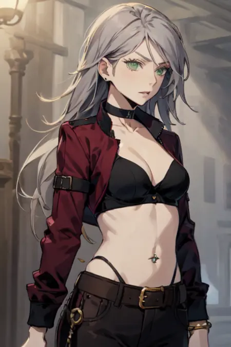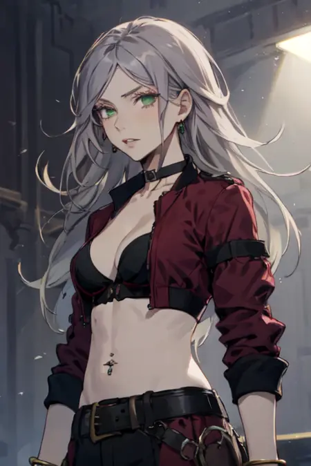 JudithUnlight, 1girl, solo, long hair, navel, cleavage, jewelry, medium breasts, green eyes, cropped jacket, grey hair, choker, midriff, belt, bracelet, cropped jacket, navel piercing
