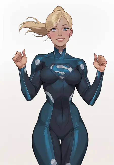 For her Kryptonian outfit try: **ponytail,krypton suit, krypton bodysuit, blue superman logo (**this gives inconsistent result, especially when it comes to superman logo, but worth trying)