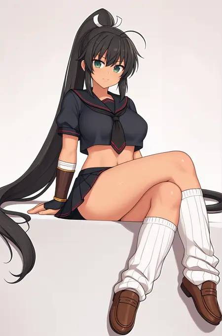 Trigger Word for the LoRA are: "Homura_IL, dark green eyes, black hair, long ponytail, white hair ribbon, large breasts, tan,"
