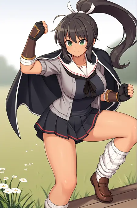 Trigger Word for shinobi outfit are: "Homura_shinobi, black dress, white sailor collar, red collar ribbon, red stripe piping, unbuttoned gray cardigan, black cape, neck cloak fastener, forearm guards, bandaged thigh, white loose socks, brown loafers"