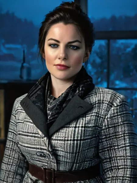 blue eyes and dark brown hair tied in a bun, wearing a checked grey and white knee-length coat, a grey scarf, dark brown patterned gloves, and black boots
