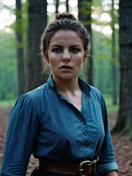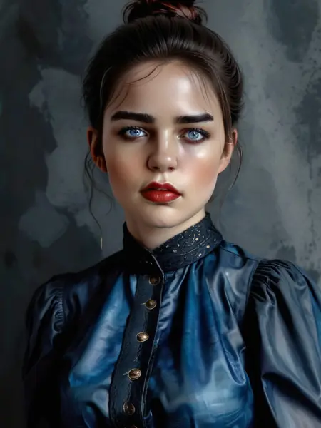 blue eyes and dark brown hair tied in a bun, wearing a blue blouse, a worn-looking black belt, a dark blue long skirt, and black boots