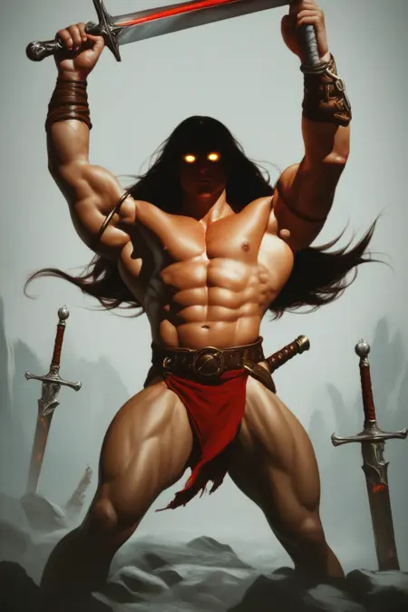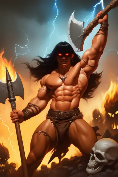 Example Trigger word to use: muscular, glowing, chain, topless male, skull, hammer, lightning, fire, weapon, abs, glowing eyes, spikes, girl, sword, retro art style, blood, axe, death, demon, corpse, jewelry, necklace, holding weapon, polearm, riding horse, horse back riding, rock, molten rock, holding, dual wielding, multiple girls, nude, multiple boys, wings, bracelet, monster girl, snake, fantasy, dragon, hammer, lightning, corpses, whip, planted, planted sword, mace, tail, horns, pointy ears, armor, arms up, demongirl, spear, angel, magic