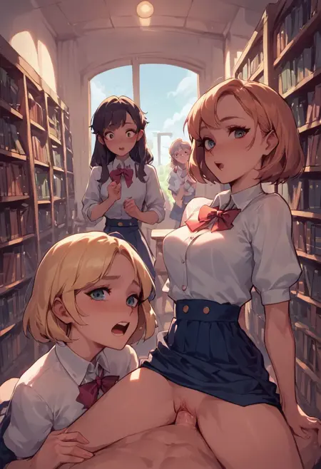 core_9, score_8_up, score_7_up, 2girls, walk-in, caught, blowjob, expressive, looking at viewer, watched, upper body, pov.