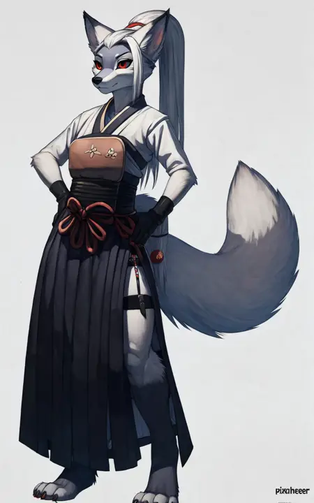 強化タグ:二足歩行、フューリー、フューリー女性、動物の耳、尾、体毛、長い髪、キツネガール、キツネの尾、キツネの耳、動物の足、動物の鼻、赤い目、白い髪、ポニーテール、白い毛、爪**