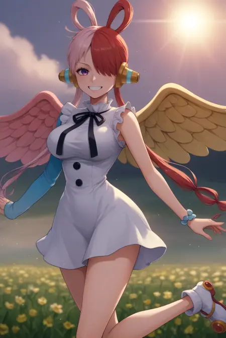 衣装: ["Uta, 紫色の目, 長い髪, 色分けされた髪, 片方の目を覆う髪, 髪の輪, ヘッドフォン, 白いドレス, フリル, 首リボン, 片袖, 長い袖"]