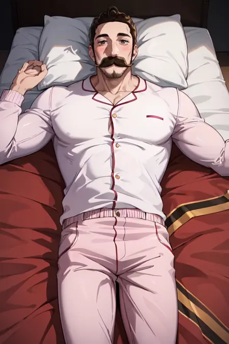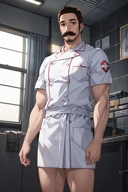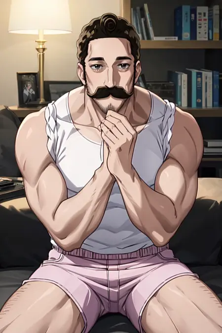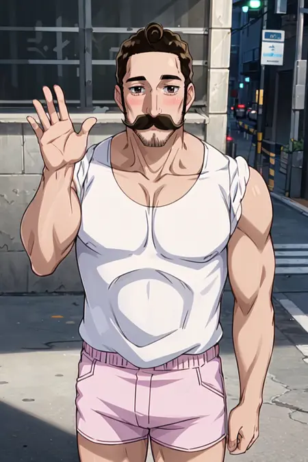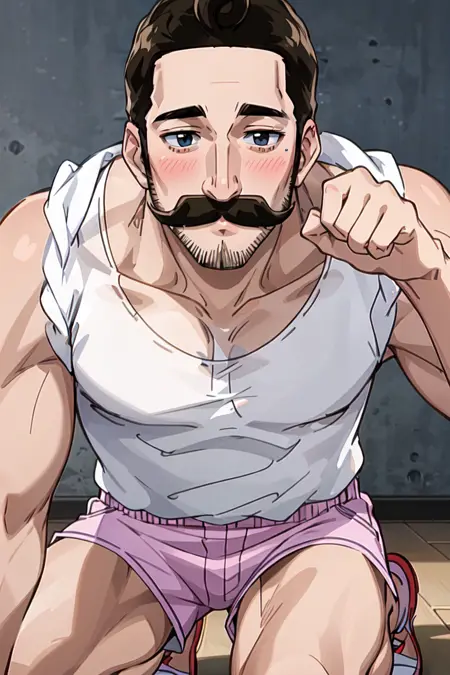 외모: alaindelon, 수염, 안면 털, 근육질, 흰 티셔츠, 분홍색 반바지 (여성복을 사용한다면 1boy)