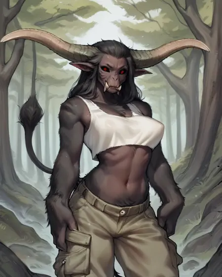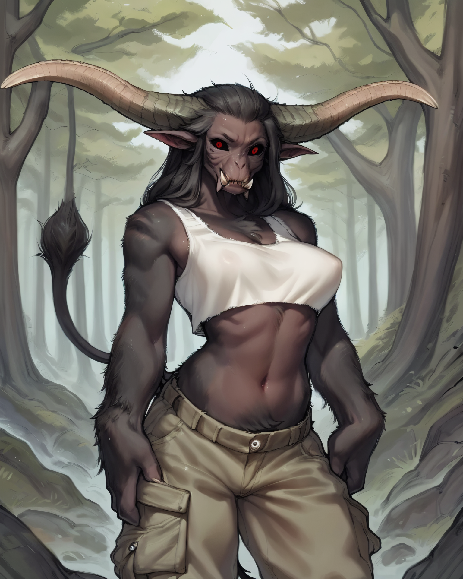 Recommended positives: mhrjng, red eyes, black sclera, tusks*, 3 fingers*, blonde hair**, yellow stripes**, red hands**