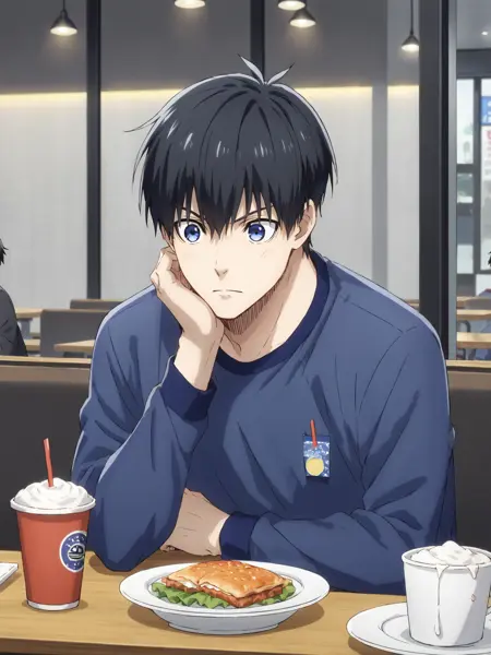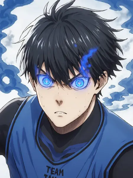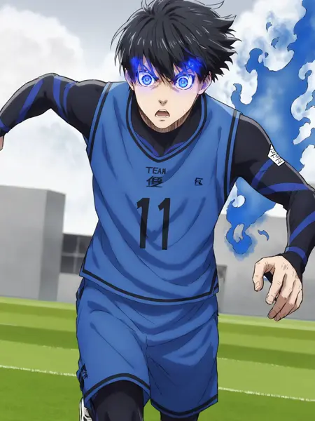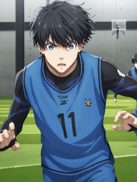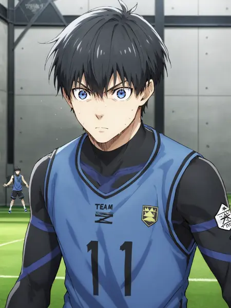 "1boy, Isagi Yoichi, male focus, black hair, blue eyes, sportswear"