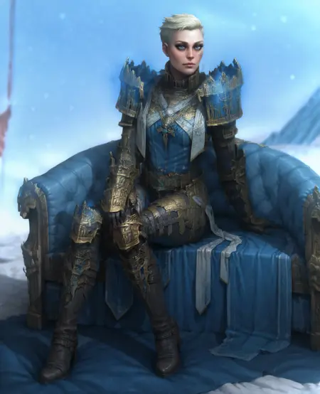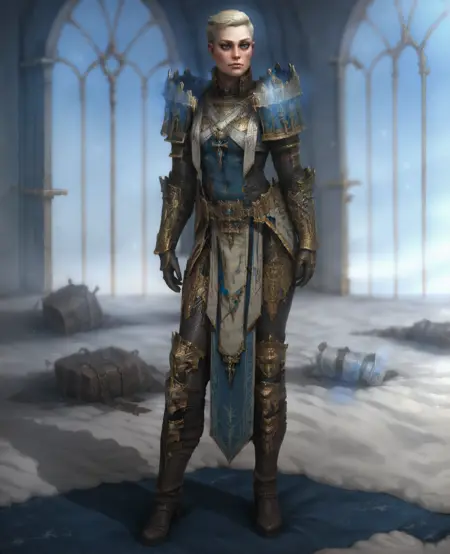 복장: 갑옷, 파란색 테이버드, 큰 팔더런, 기사 전체 갑옷