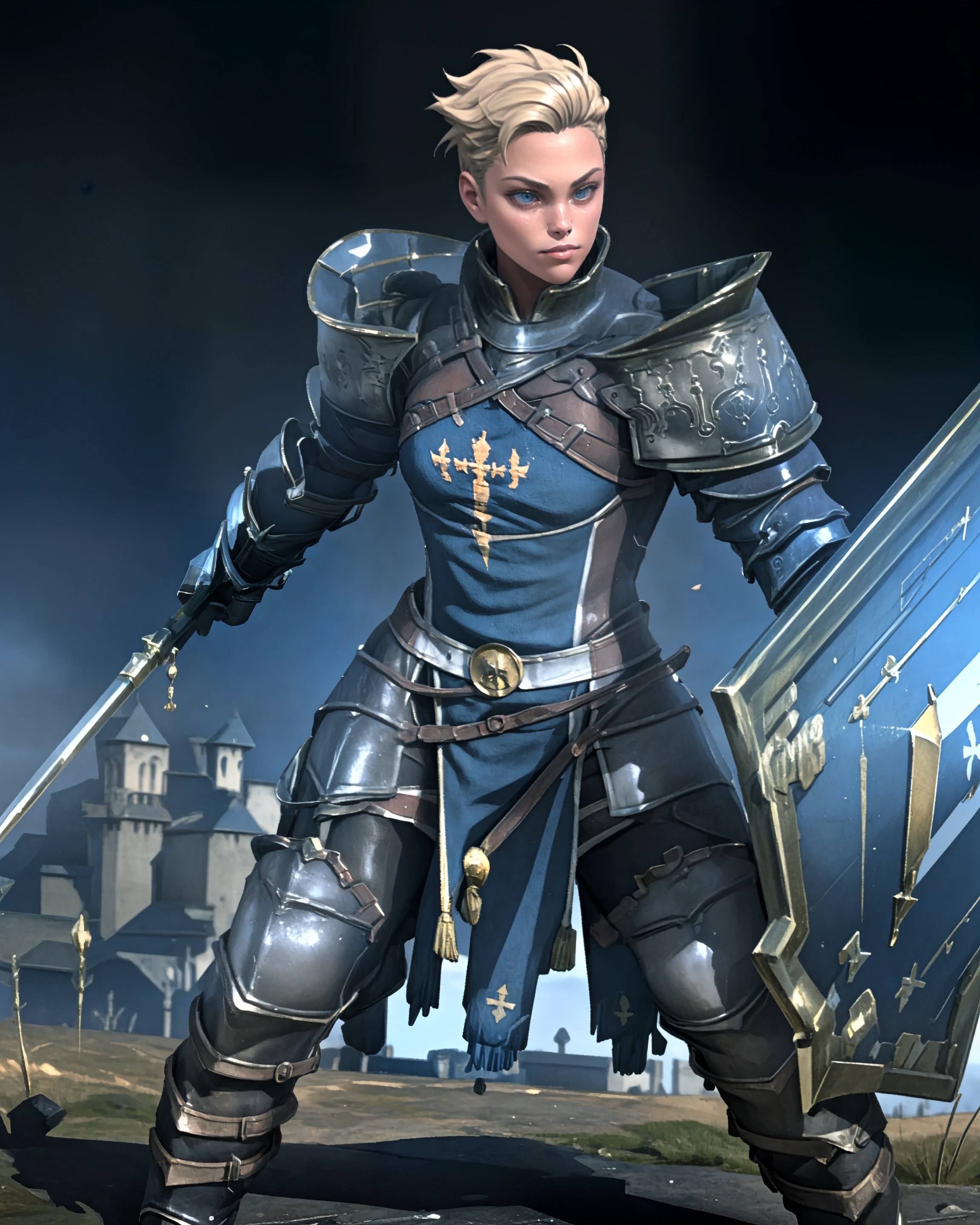 복장: 갑옷, 파란색 테이버드, 큰 팔더런, 기사 전체 갑옷
