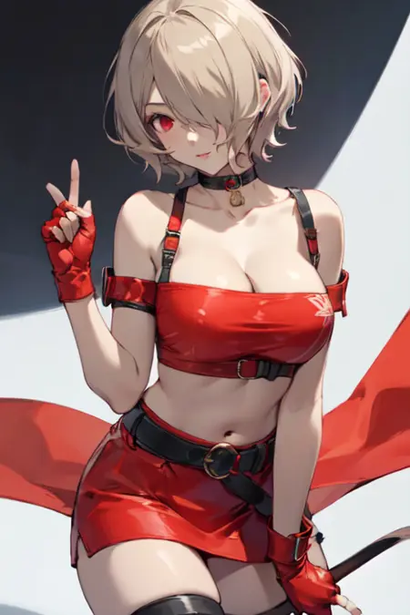 | Trained Words | RitaRQ, 1girl, solo, short hair, miniskirt, large breasts, light brown hair, red eyes, thighhighs, fingerless gloves, cleavage, bare shoulders, collarbone, black choker, midriff, belt, hair over one eye, red crop top, thigh strap, red skirt, red gloves, rita rossweisseCopied! |