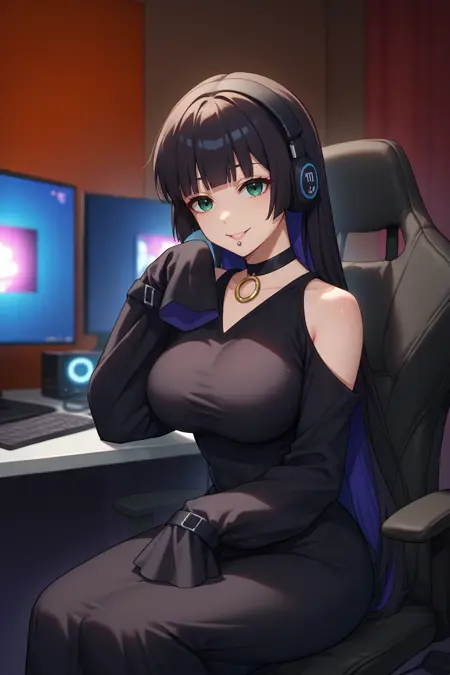 服装:项圈,黑色连衣裙,长裙,露肩设计,袖子长过手指