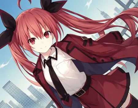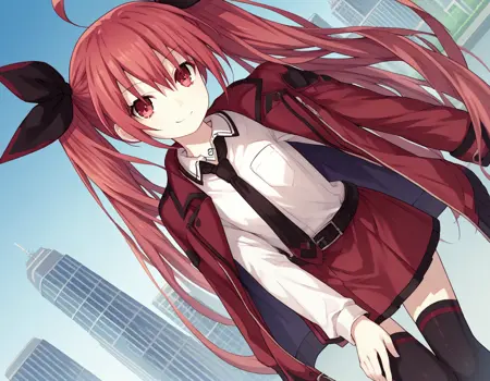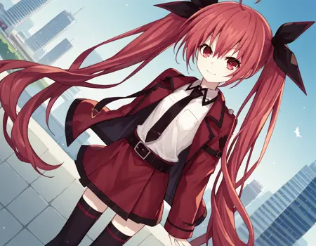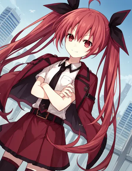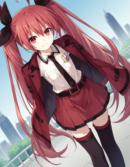kotori itsuka commander, long hair, skirt, shirt, red eyes, thighhighs, ribbon, twintails, very long hair, school uniform, jacket, white shirt, ahoge, red hair, boots, necktie, belt, black thighhighs, black footwear, zettai ryouiki, red skirt, thigh boots, candy, lollipop, jacket on shoulders, red jacket,