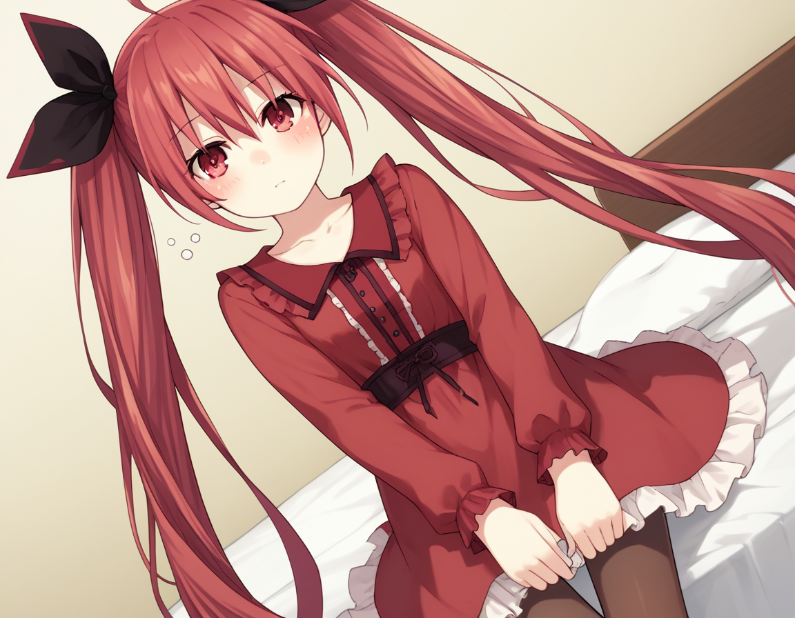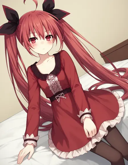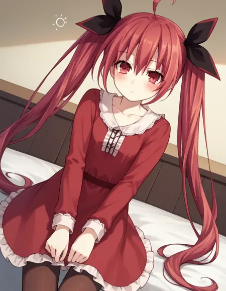kotori itsuka casual, long hair, red eyes, dress, twintails, ahoge, red hair, candy, lollipop, frills, long sleeves, collarbone,
