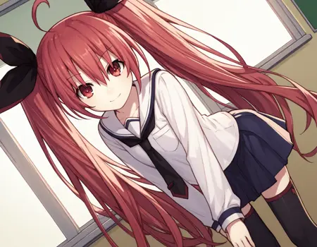 kotori itsuka school uniform, long hair, skirt, shirt, red eyes, thighhighs, long sleeves, ribbon, hair between eyes, twintails, very long hair, school uniform, white shirt, ahoge, red hair, pleated skirt, necktie, serafuku, black thighhighs, tree, blue skirt, zettai ryouiki, candy, black necktie, lollipop,
