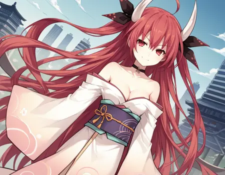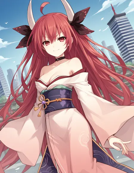 kotori itsuka astral dress, long hair, red eyes, ribbon, bare shoulders, red hair, japanese clothes, horns, choker, kimono, fire,