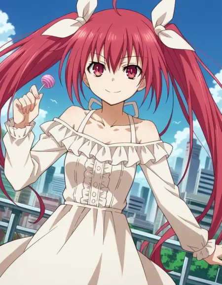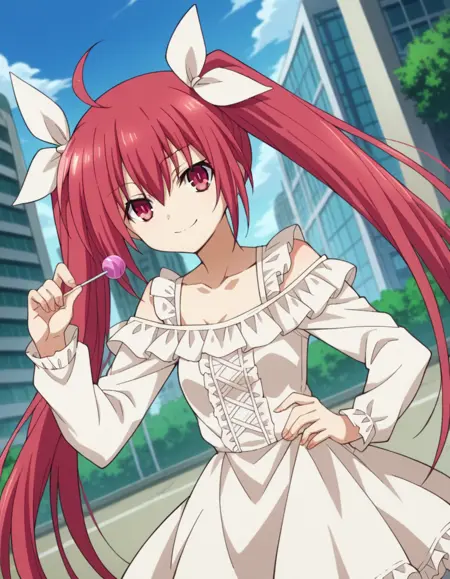 kotori itsuka casual, long hair, red eyes, dress, twintails, ahoge, red hair, candy, lollipop, frills, long sleeves, collarbone,