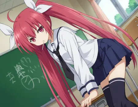 kotori itsuka school uniform, long hair, skirt, shirt, red eyes, thighhighs, long sleeves, ribbon, hair between eyes, twintails, very long hair, school uniform, white shirt, ahoge, red hair, pleated skirt, necktie, serafuku, black thighhighs, tree, blue skirt, zettai ryouiki, candy, black necktie, lollipop,