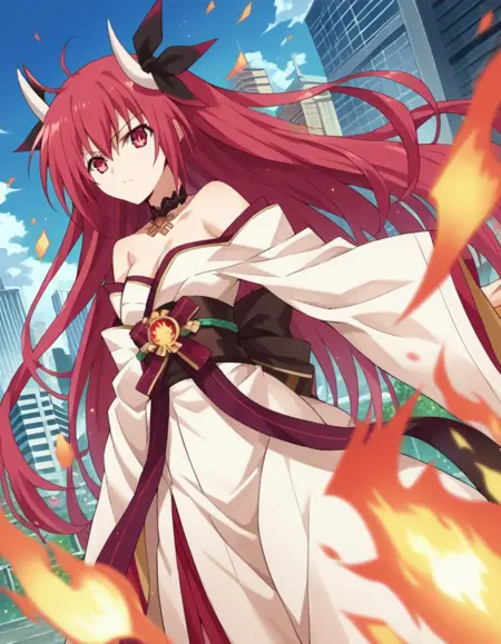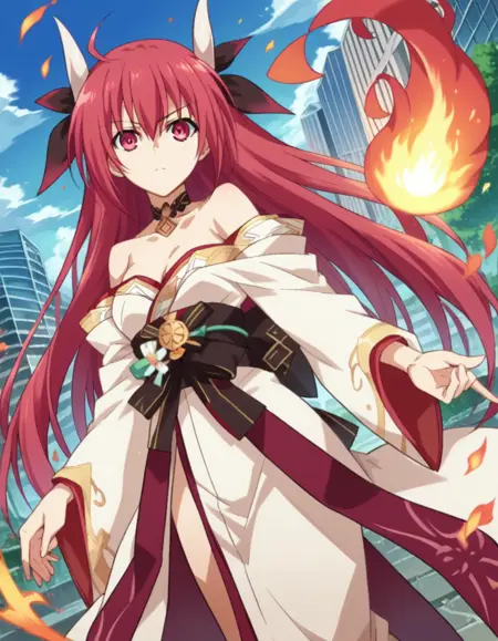 kotori itsuka astral dress, long hair, red eyes, ribbon, bare shoulders, red hair, japanese clothes, horns, choker, kimono, fire,