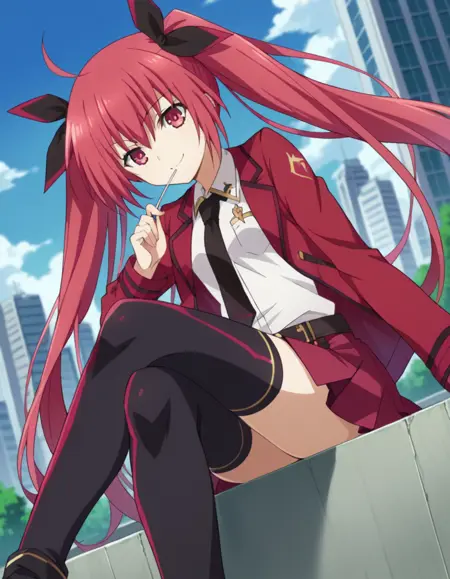 kotori itsuka commander, long hair, skirt, shirt, red eyes, thighhighs, ribbon, twintails, very long hair, school uniform, jacket, white shirt, ahoge, red hair, boots, necktie, belt, black thighhighs, black footwear, zettai ryouiki, red skirt, thigh boots, candy, lollipop, jacket on shoulders, red jacket,