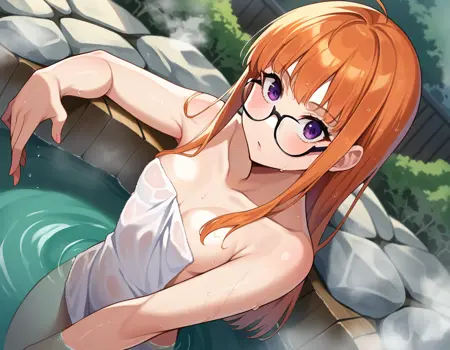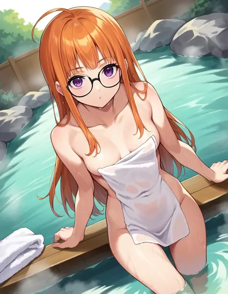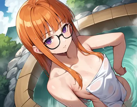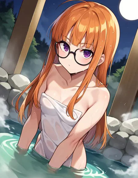 futaba sakura, orange hair, long hair, purple eyes, ahoge,