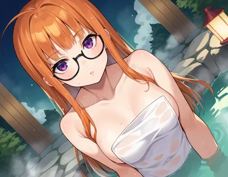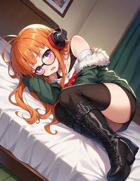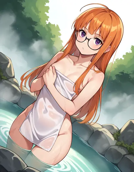 futaba sakura, orange hair, long hair, purple eyes, ahoge,