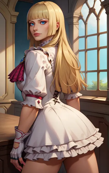提示词:emiliederochefortSDXL, 1girl, solo, long hair, smile, blue eyes, blonde hair, room background, gloves, white dress, frills, white gloves, fingerless gloves, white dress, lips, ascot, makeup, frilled dress, hime cut,